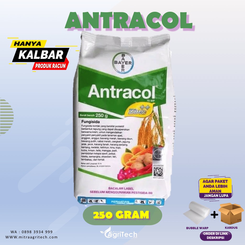 Sumber: Internet*PRODUK ORIGINAL "ASLI", BUKAN PALSU**HATI-HATI PRODUK SEJENIS DENGAN HARGA MURAH*Spesifikasi Antracol 70WP Kemasan Pabrik 250 GramMerk dagang : Antracol 70WPJenis : FungisidaBahan aktif : Propinep 70%Formulasi : WP (Wattable Powder)Warna : Krem/putih kekuninganCara kerja : KontakBentuk fisik : TepungProdusen : PT. Bayer IndonesiaDosis & Cara Penggunaan:1. Dosis disesuaikan dgn usia tanaman & jenis tanaman, lihat pd kemasan2. Fungisida Antracol 70WP dilarutkan dgn air, diaduk hingga produk tercampur rata3. Gunakan sprayer utk menyemprotkan larutan fungisida ketanaman4. Tambahkan perekat, pembasah & perata jika diperlukan5. Supaya lbh efektif sebaiknya penyemprotan dilakukan sejak dini6. Penyemprotan sebaiknya dilakukan pd pagi hari & sore hariKelebihan Fungisida Antracol 70WP1. Fungisida bekerja secara kontak langsung yaitu fungisida akan langsung bekerja ketika larutan yg disemprotkan bersentuhan dgn tanaman yg terinfeksi2. Antracol 70WP berbentuk tepung dpt disuspensikan dgn air & larut dgn segera sehingga penggunaannya lbh mudah & praktis3. Dpt digunakan pd segala musim, baik musim kemarau maupun musim hujan4. Dpt digunakan utk mengendalikan penyakit jamur pd banyak jenis tanaman5. Fungisida Antracol 70WP bersifat racun kontak& tdk dpt menembus jaringan tanaman sehingga residu lbh rendah#FUNGISIDA #ANTRACOLDemi keamanan packing agar isi paket tidak rusak saat diterima oleh pembeli, kami menyediakan plastik bubble dan packing kardus tambahan untuk tambahan packing. ORDER DILINK DIBAWAH INI :BUBBLE WARP :https://shopee.co.id/product/4579170/3335251367/KARDUS:https://shopee.co.id/product/4579170/4535155568Apabila item ini tidak add to cart jangan salahkan kami apabila ada barang yg penyok, pecah atau rusak saat perjalanan pengir