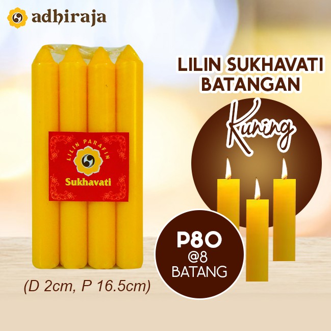 Lilin Sukhavati dibuat dengan paraffin berkualitas sehingga menghasilkan nyala lilin yang bersih dan stabil.isi 8 batang/bungkus-Ongkos Kirim ditanggung oleh Pelanggan-Barang yang dipesan sudah kami cek terlebih dahulu sebelum dikirimkan-Kami tidak bertanggung jawab apabila terjadi kerusakaan barang yang terjadi saat pengiriman-Semua packingan sudah mendapatkan Bubble Wrap gratis“Barang pecah/rusak karena pengiriman bukan mejadi tanggung jawab kami karena sebelum dikirim sudah kami cek terlebih dahulu""Disarankan tanya stock terlebih dahulu sebelum memesan bar