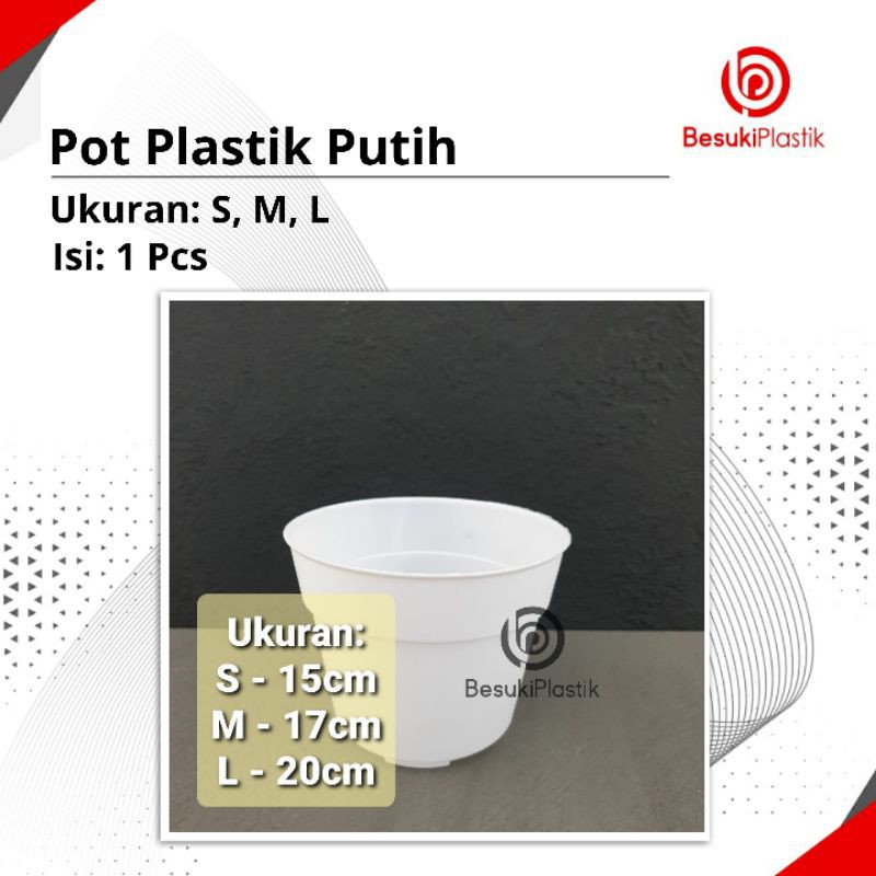 Pot Plastik Putih / Ember Putih / Pot Putih / Pot Plastik!!! HARGA PER 1 PCS !!! 1 KG = 5 PCS Variasi:- Kecil (15cm)- Tanggung (17cm)- Besar (20cm)SPECS:- Bahan: Plastik- Ukuran: Kecil, Tanggung, Besar- Warna: Putih- Isi: 1 Pcs#pot #potputih #bskplast #besukipla