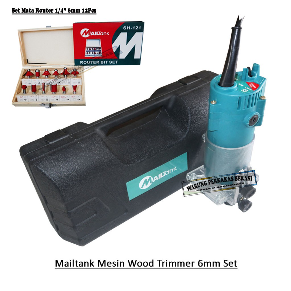Pusat Grosir Perlengkapan di Kota Sukabumi Paket Mailtank Wood Trimmer 6mm 1/4" Mesin Profil List Kayu Sh-134 Dan Mata Router Set 12pcs Sh-121 dari Mailtank Kab. Bekasi