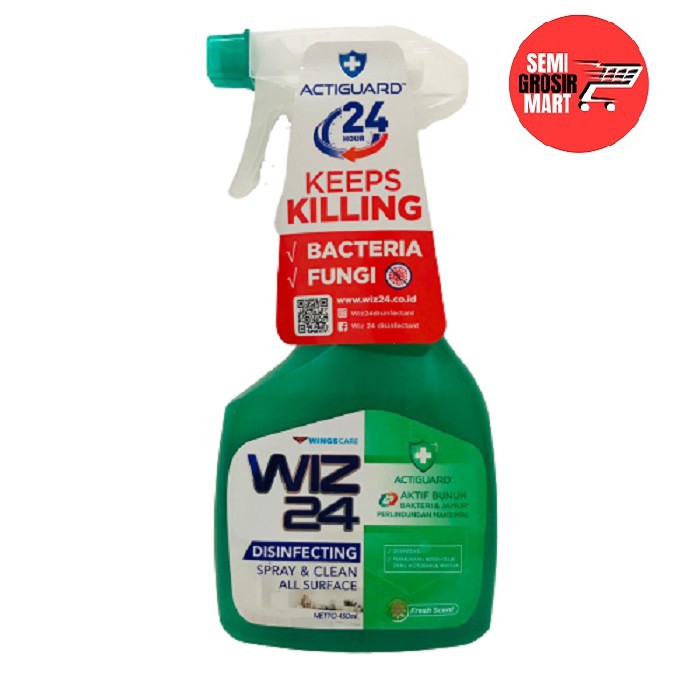 ACTIGUARD adalah bahan aktif yang terkandung dalam WIZ 24. ACTIGUARDsatu-satunya patented technology antimicrobial yang dapat terus-menerus membunuhkuman, bakteri & jamur dari awal pemakaian hingga 24 jam. Permukaan tetapterlindungi, walaupun telah berkali-kali disentuh. ACTIGUARD telah melewati ujistandarisasi EPA (Environmental Protection Agency) dan FDA (Food and DrugAdministration) di Amerika. Terbukti WIZ 24 aktif membunuh kuman, bakteri &jamur dari awal pemakaian hingga 24 jam. Permukaan terlindungi meskipunberkali-kali disentuh."Cara Penggunaan :Untuk fungsi desinfeksi * Semprotkan WIZ 24 secara merata pada jarak 15–20 cm dari permukaan perabotan atau peralatan yang akan dibersihkan sampai basah. * Biarkan selama 60 detik dan lap dengan kain bersih. * Untuk perlindungan maksimal sejak pemakaian awal hingga 24 jam, biarkan selama 5 menit dan lap dengan kain bersihUntuk fungsi membersihkan * Semprotkan WIZ 24 secara merata pada jarak 15–20 cm dari permukaan perabotan atau peralatan dan lap dengan kain bersih"Dengan format aerosol spray yang praktis, dapat digunakan disemua permukaan: * Permukaan keras (hard surface) seperti Meja, kursi, pegangan pintu dll * Pemukaan halus (soft surface) seperti, Sofa, Gorden, Tas, Helm, Jok Mobil dll * Benda elektronik seperti smart phone, remote control dll * Mendesinfeksi udara di ruanganExp September