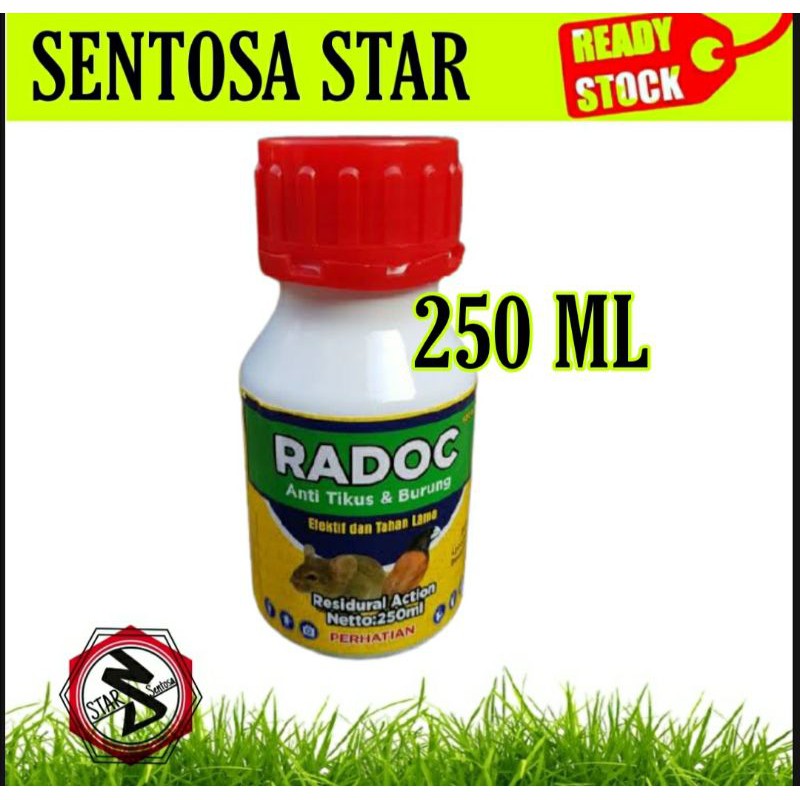 Bahan Aktif Lycocium 35%, Besanet 1,75g/lUkuran besar 250 mLRadaoc adalah rodentisida berbentuk larutan bagi tanaman padi,palawija dan tebu yang berfungsi untuk mengusir tikus, burung dan serangga lainya dengan daya kerja yang tepat, efektif dan tahan lama.Petunjuk Penggunaan, Larutkan 1 sd 3ml/liter pada air dan semprotkan secara merata pada tanaman secara berulan-ulang, lakukan dengan interval 7-10 hari sekali, dengan demikian tikus dan burung tidak berani mende