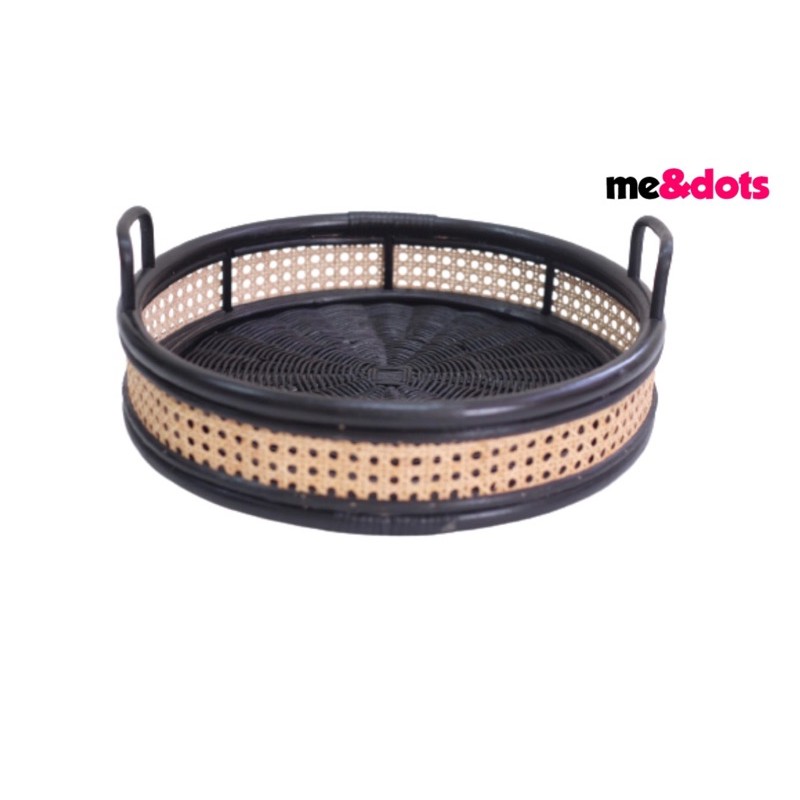 Nampan bulat dengan bahan rotan asli memiliki anyaman rotan webbing dengan ukuran:Diameter = 40cm Tinggi = 6cm Dengan warna hitam kombinasi webbing dengan warna natural sehingga mempermanis penataan meja makan dir